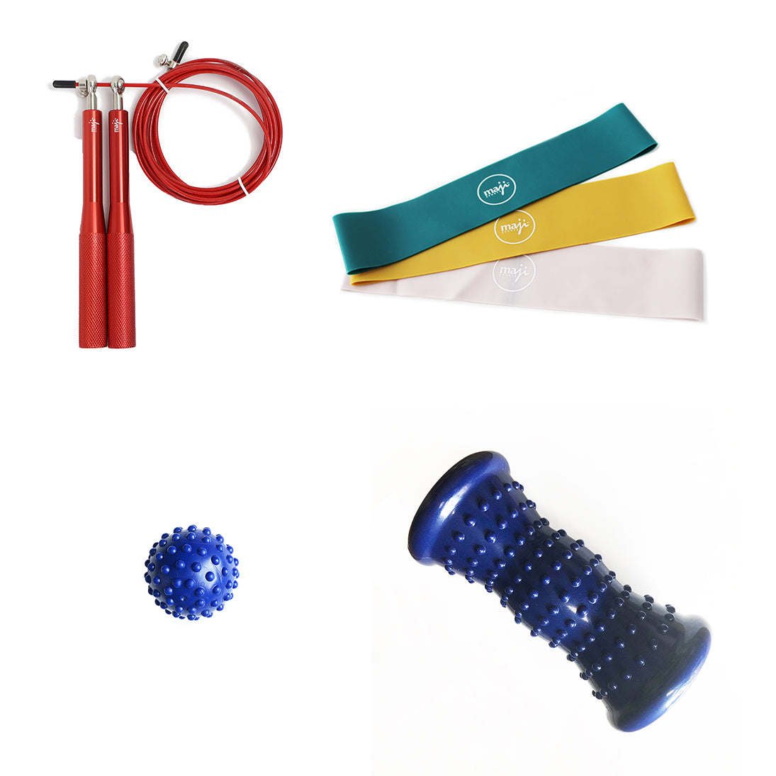 FOOT MASSAGER 5CM - BELLA: The Foot Massager relieves stiffened muscles and tissues in hands, arms, legs & feet. It stimulates & soothes any sore or tired muscle when you roll it under your feet. A great choice to relieve Plantar Fasciitis, its small size makes it easy to carry and to use it anywhere, anytime.HIGH SPEED JUMP ROPE (WITH ALUMINIUM HANDLES): Whether you are a beginner or are pro-level athlete, this jump rope will be your perfect cardio companion. From normal skipping to serious jump rope training. This rope has been designed to suit all requirements Weighing only 180g, this jump is a great tool for high speed cardio routine. The 360-degree double ball bearing system makes it tangle and twist free. PVC coated steel cable, ball bearings for proper rotation, smooth motion and super-fast speeds for light warm-ups to gruelling cardio routines. Textured aluminium handles make this jump rope slip resistant.FOOT MASSAGER - 7.5 X 17.5 CM: The Foot Massager relieves stiffened muscles and tissues in hands, arms, legs & feet. It stimulates & soothes any sore or tired muscle when you roll it under your feet. A great choice to relieve Plantar Fasciitis, its small size makes it easy to carry and to use it anywhere, anytime. The unique pressure points and arc design of the massage roller can greatly relieve muscle pain.PACK OF THREE LOOP RESISTANCE BANDS: Strengthen & tone legs, hips, gluts & more. Ideal for strengthening muscles, Pilates, yoga, gym exercises & Resistance Training. Great physical therapy tool for muscular rehabilitation & improving mobility. Minimizes pressure on joints when compared to weight-training exercises. The great travel exercise companion