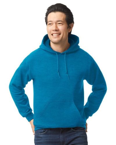 8 oz., 50% USA cotton, 50% polyester; Heather Sport colors: 60% polyester, 40% cotton; Made with 50% sustainably and fairly grown USA cotton; Pill-resistant air jet yarn; Double-needle stitching throughout; Double-lined hood; Pouch pocket; matching drawcord; 1x1 ribbed cuffs and waistband with spandex; Safety Orange is compliant with ANSI - ISEA 107 High-visibility Standards; Tear away label; Gildan's manufacturing process utilizes 45% renewable energy; Gildan's Community Investment Program supports education, the environment, humanitarian aid and active living in the communities we do business in;